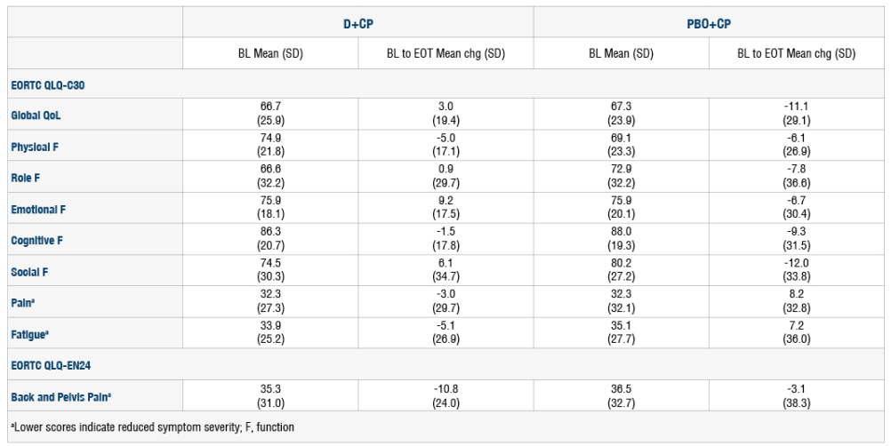 根据ESMO 2023大会上公布的患者报告结局(PROs)结果,在RUBY试验中118例错配修复缺陷/微卫星不稳定性高(dMMR/MSI-H)的原发晚期或复发子宫内膜癌患者中,dostarlimab加化疗与安慰剂加化疗相比有改善(摘要号:749P)。在治疗过程中,使用EORTC QLQ-C30评分从基线到治疗结束的平均变化进行评估,患者总体生活质量(QoL)(3.0)、情绪功能(9.2)、社交功能(6.1)和疼痛(-3.0)均有改善。背部/骨盆疼痛也有所改善,EORTC QLQ-EN24评分从基线到治疗结束平均降低-10.8。背部/骨盆疼痛是唯一一个使用生活质量工具测试的领域,在接受安慰剂和化疗的患者中,显示基线和治疗结束后有改善(-3.1)。