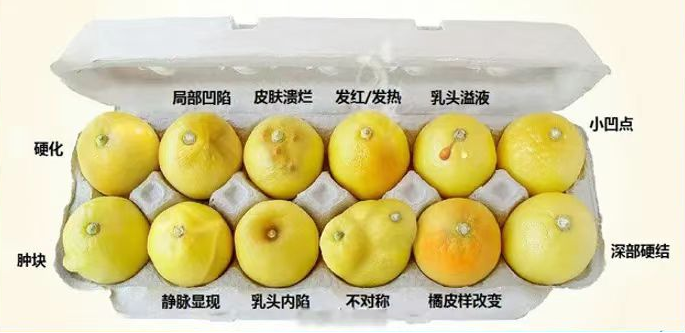 我们常常会把健康的乳房看作成一枚光滑、亮洁、平整的澳橘。当乳房出现不正常的状况、乃至发展成乳腺癌时,在“橘子”的表皮和内部都存在不同程度的变化,或者存在肿块结节,或者乳头溢液,或者乳头湿疹样反复破溃,或者乳头凹陷,或者皮肤增厚水肿,又或者皮肤出现新的“酒窝”样改变。因此女性朋友们应做到“九字箴言”,时常“看一看”、“摸一摸”、“挤一挤”,一旦发现不正常的状况,应及早就医检查。