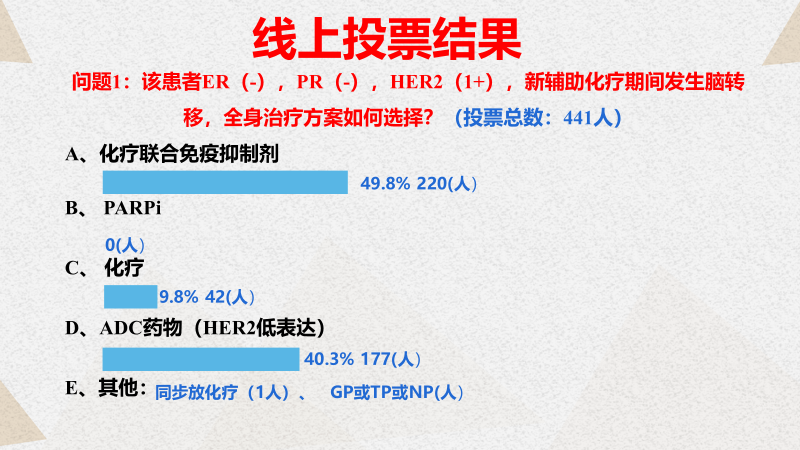 网上医生投票结果揭晓:接近一半(49.8%)的医生投票建议选择化疗联合免疫抑制剂,另有40.3%选择ADC药物。