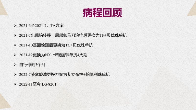杨华教授:回顾整个病程,从21年6月患者确诊以来,两年的时间里经历了非常艰难的一系列治疗:21年7月份在TA新方案之后出现了脑转移,局部伽玛刀治疗后更换为TP+贝伐珠单抗。后续基因检测后,更换为TC+贝伐珠单抗,疗效不理想,则进一步使用了NX+卡瑞利珠单抗治疗了4个周期,但因副作用而停药。22年7月又出现了腋窝淋巴结的进展并且破溃,继而更换为艾立布林+帕博利珠单抗但效果不理想。从22年11月开始使用DS-8201(T-DXd,德曲妥珠单抗)至今。我们可以从患者有限的影像学的资料中看到一个相对理想的效果,可以说DS-8201(T-DXd,德曲妥珠单抗)给患者提供了新的疗效升级。