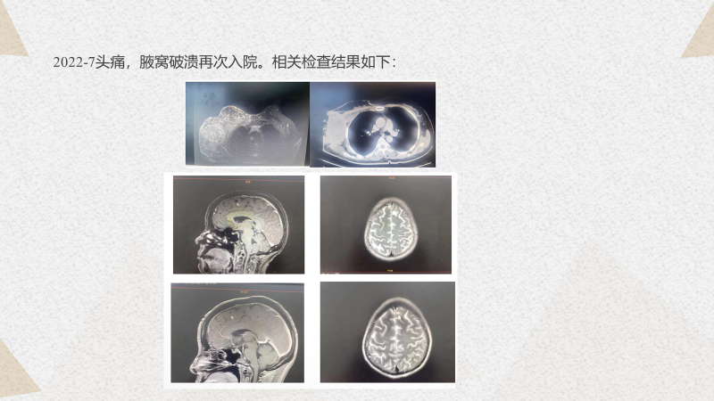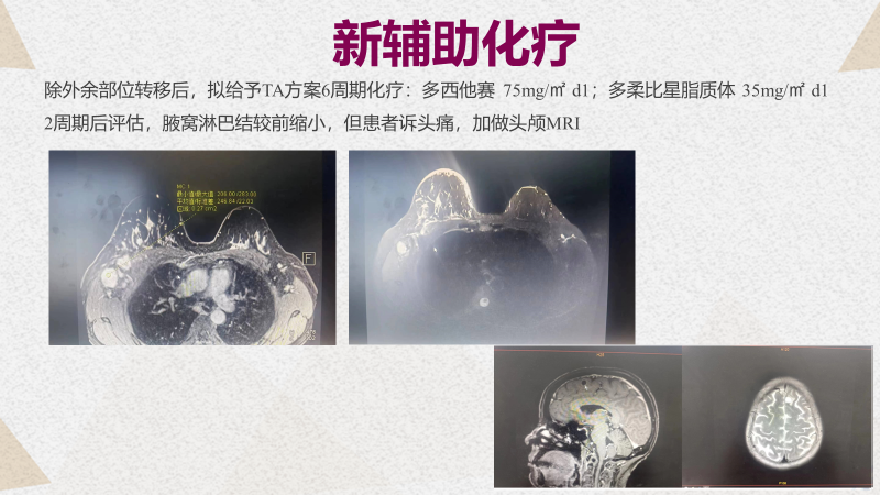 欧阳取长教授:这个病例当时是一个局部晚期,现在虽然是出现了脑转移的进展,但原发灶和右淋巴结是缩小的。这种情况下我们是不是先考虑头部的局部治疗,包括头部局部放疗等等,特别是病人有头痛,不明确是不是脑水肿也比较明显,或者说目前还是以全身治疗为主,兼顾脑转移灶的治疗。目前我们很多常规化疗药物、细胞毒药物对脑转移基本效果不明显。所以可以考虑兼顾脑转移灶治疗的情况下,优先选择ADC药物,像DS-8201(T-DXd,德曲妥珠单抗)这一类药物。大家知道DS-8201(T-DXd,德曲妥珠单抗)对脑转移、脑膜转移还是有一定效果的。第二选择的是化疗,因为原发灶和腋窝淋巴结在前面化疗方案治疗下有缩小,但出现了脑转移,这种情况下我们需要思考到底要不要换化疗方案,这点是非常重要的。所以我的治疗推荐,是优先选择ADC药物,其次是化疗,当然如果说后续检测PD-L1阳性或者说BRCA突变等等,那么免疫治疗、PARP抑制剂等也是可以考虑的。在这个过程中,我们还要权衡一下头部病灶要不要优先考虑局部治疗。