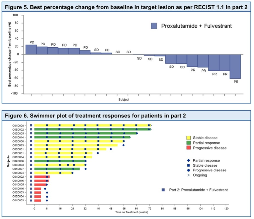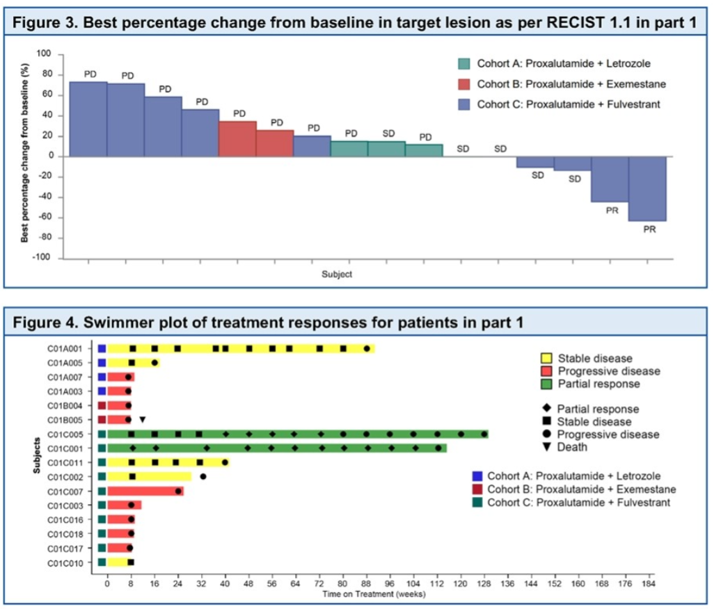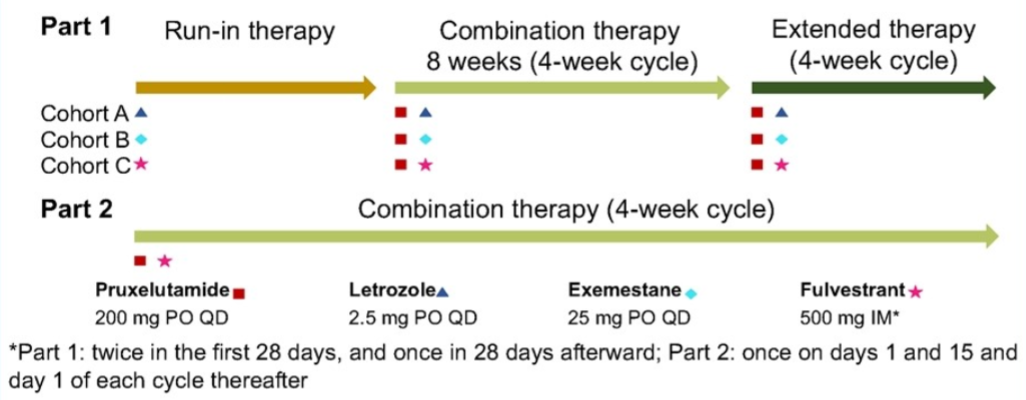 该研究分两部分(Part1和Part2)进行。Part1纳入了多线治疗后进展的患者。单药治疗阶段包括队列A的来曲唑(第1-14天,2.5 mg/天),队列B的依西美坦(第1-14天,25 mg/天),队列C的氟维司群(第1、15和28天,肌肉注射500mg/次),随后以28天为一个疗程,联合使用普克鲁胺200 mg每日一次(QD)。Part2包括队列D,为一线治疗进展或不耐受的患者,入组后接受普克鲁胺200mg QD联合氟维司群(第1、15天分别肌肉注射500 mg/次,之后每个疗程的第1天注射一次)。研究终点包括安全性和疗效性。