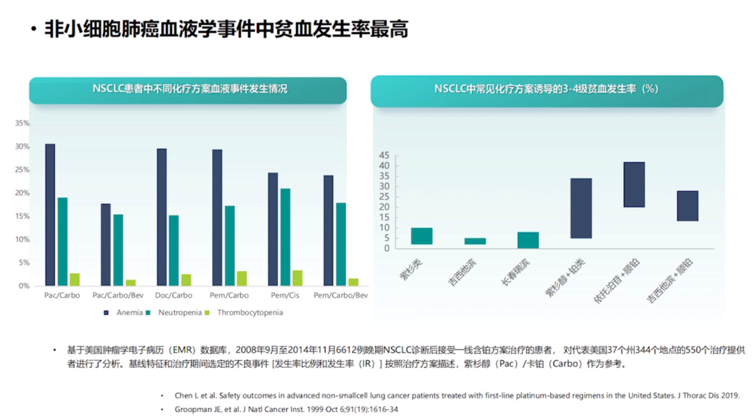 对于小细胞肺癌而言,美国一项超过26000例的回顾性分析显示老年SCLC患者贫血发生率达71.7%,由于红细胞寿命相对较长,贫血具有延迟发生的特点,一线化疗中位贫血发生时间在第41天,二线化疗则在第75天,此时患者往往在院外,极其容易忽视。肿瘤相关贫血危害严重,约有40%的患者需要输血治疗,约1/4的≥3度贫血患者会入住ICU,40%的患者赴急诊就诊,70%的患者住院,其紧急性和严重性可见一斑[9]。
