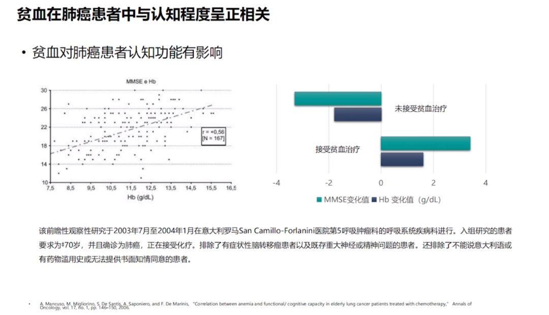 贫血不仅仅降低肺癌的治疗效果,还降低了患者的生活质量。意大利一项针对≥70岁肺癌患者的研究显示,接受贫血治疗的患者的简易精神状态检查量表(MMSE)的呈正向变化,而未接受贫血治疗的则呈负向变化,认知功能变差[14]。