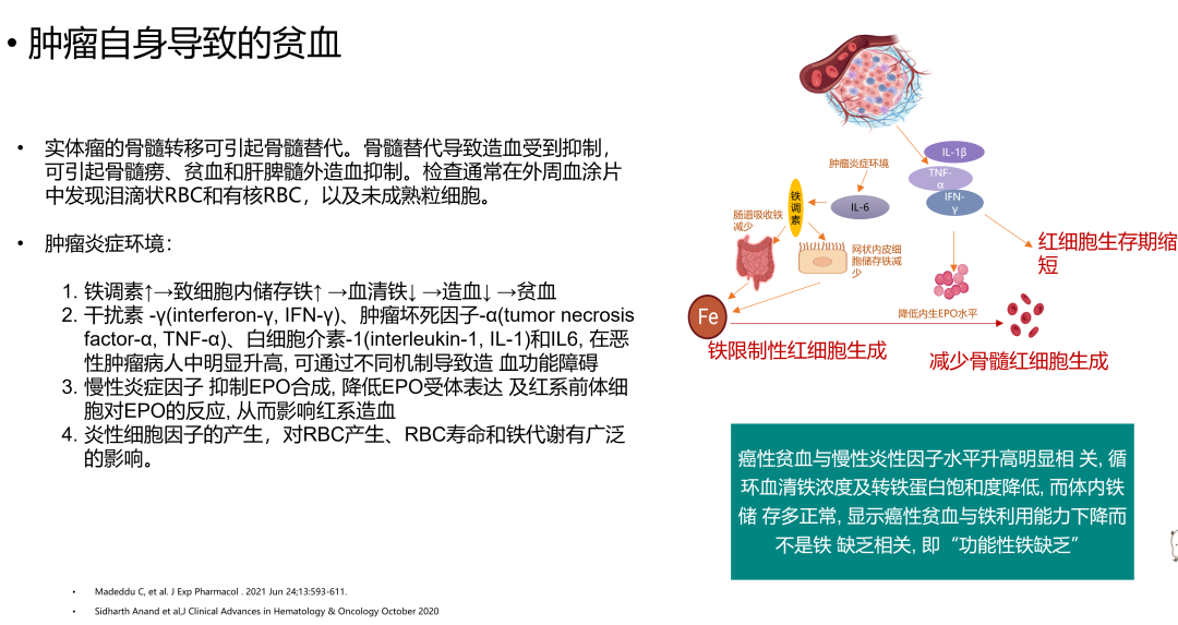肿瘤本身可能也与贫血的发生相关。一方面,实体瘤的骨髓转移可使肿瘤细胞替代骨髓中的造血干细胞,导致造血抑制。另一方面肿瘤炎性环境使得铁调素(Hp)表达升高,癌细胞处于高铁状态,而血清中铁浓度和铁转运蛋白(Fpn)饱和度降低,引起“功能性缺铁”;肿瘤炎症环境产生的慢性炎症因子还会抑制EPO合成,影响造血功能,也会直接降低更好红细胞寿命,进一步加重贫血[16,17]。