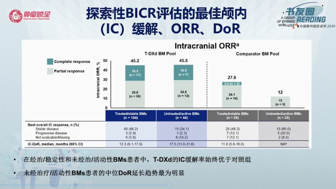 BICR评估的脑转移患者颅内ORR结果显示,T-DXd组经治的/稳定性脑转移患者ORR为45.2%(CR 16.3%,PR 28.8%),未经治的/活动性脑转移患者ORR为45.5%(CR 15.9%,PR 29.5%)。对照组经治的/稳定性脑转移患者ORR为27.6%(CR 3.4%,PR 24.1%),未经治的/活动性脑转移患者ORR为12。在经治的/稳定性和未经治的/活动性脑转移患者中,T-DXd的BICR评估的缓解率始终优于对照组。T-DXd组经治的/稳定性脑转移患者的中位DoR为12.3个月,未经治的/活动性脑转移的中位DoR为17.5个月,对照组则分别为11.5个月和NA。未经治的/活动性脑转移患者的中位DoR延长趋势最为明显。