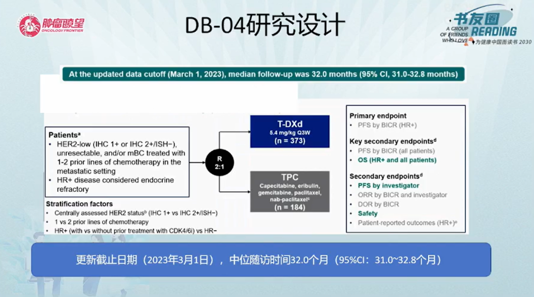 在传统HER2阴性mBC病例中,约60%为HER2低表达(IHC 1+或IHC 2+/ISH-),T-DXd是一种靶向HER2的抗体偶联药物,而且通过“旁观者效应”对临近肿瘤细胞产生作用。DB-04研究的首次分析显示(数据截止日期,2022年1月11日,中位随访18.4个月),T-DXd相较于TPC具有更好的PFS和OS,DB-04首次将HER2低表达mBC确立为可靶向治疗人群,且T-DXd成为此类患者的新治疗标准。本次分析旨在报告延长随访的最新疗效和安全性结果(数据截止日期,2023年3月1日)。