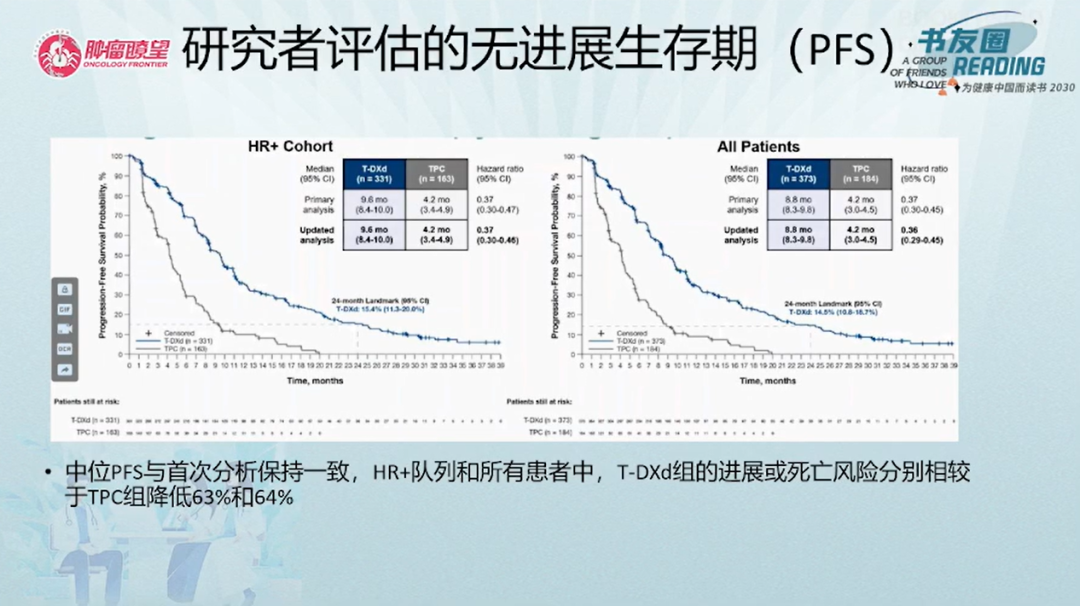 中位PFS数据显示,在HR+队列中,T-DXd vs TPC组:9.6个月(95%CI:8.4~10.0)vs 4.2个月(95%CI:3.4~4.9)(HR 0.37,95%CI:0.30~0.46)。所有患者中,T-DXd vs TPC组:8.8个月(95%CI:8.3~9.8)vs 4.2个月(95%CI:3.0~4.5)(HR 0.36,95%CI:0.29~0.45)。中位PFS与首次分析保持一致,HR+队列和所有患者中,T-DXd组的进展或死亡风险分别相较于TPC组降低63%和64%。