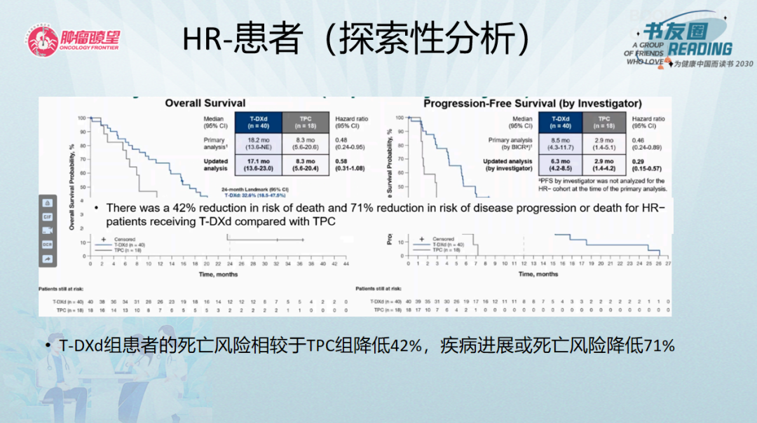 探索性分析显示,HR-队列中,研究者评估的中位PFS T-DXd vs TPC:6.3个月vs 2.9个月(HR 0.29),疾病进展风险降低71%;中位OS T-DXd vs TPC:17.1个月vs 8.3个月(HR=0.58)死亡风险降低42%。