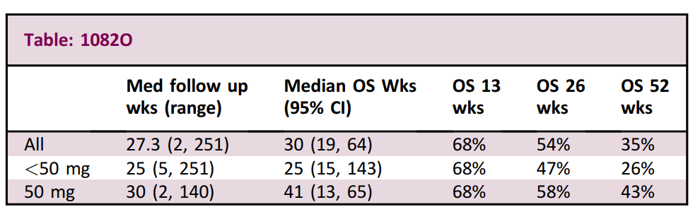 结论:这一最新分析证实了NIVO鞘内注射(50 mg)联合静脉注射的安全性,治疗组之间的OS无显著差异,在推荐剂量组未观察到非预期的毒性。这些结果支持在脑脊膜转移患者中进一步评估鞘内免疫治疗。从脑脊液样本的转化研究中获得的信息将有助于未来开发针对这些患者的鞘内注射免疫治疗策略。