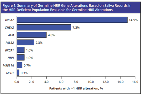 使用Ambry CustomNext-Cancer小组(对TALAPRO-2研究HRR12肿瘤基因组的12个基因中的9个进行了测序)对可进行唾液测序评估的患者中的胚系HRR突变频率进行了评估
