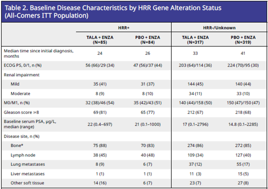 根据基线疾病特征进行的分析显示,HRR+患者从初诊前列腺癌到随机分组的时间较短,Gleason评分(≥8)、基线血清PSA中位数和淋巴结受累较高。