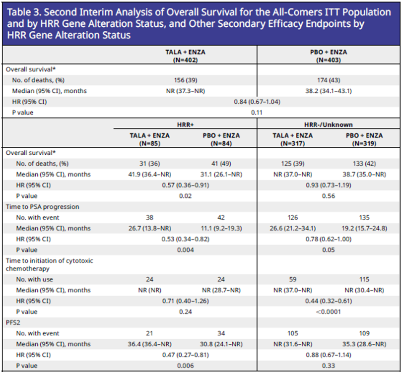 通过HRR基因突变状态对总生存(OS)进行的第二次中期分析和按HRR基因突变状态划分的其他次要疗效终点分析结果显示,尽管总生存数据还不成熟,与安慰剂加恩扎卢胺相比,他拉唑帕利联合恩扎卢胺在全人群有OS获益趋势,在HRR+人群获益更显著。他拉唑帕利加恩扎卢胺延长了PSA进展时间、至细胞毒性化疗开始时间和PFS2,在HRR+和HRR-/未知亚组中均有获益。