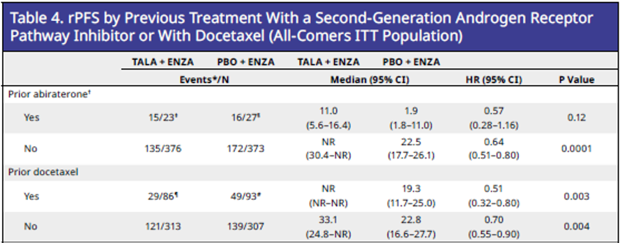 在HSPC阶段接受过阿比特龙治疗的患者接受他拉唑帕利联合恩扎卢胺治疗,其影像学进展rPFS或死亡的风险降低了43%(两个治疗组中只有6%的患者接受过阿比特龙治疗)。既往接受多西他赛治疗的患者在他拉唑帕利联合恩扎卢胺组的进展风险降低了49%。