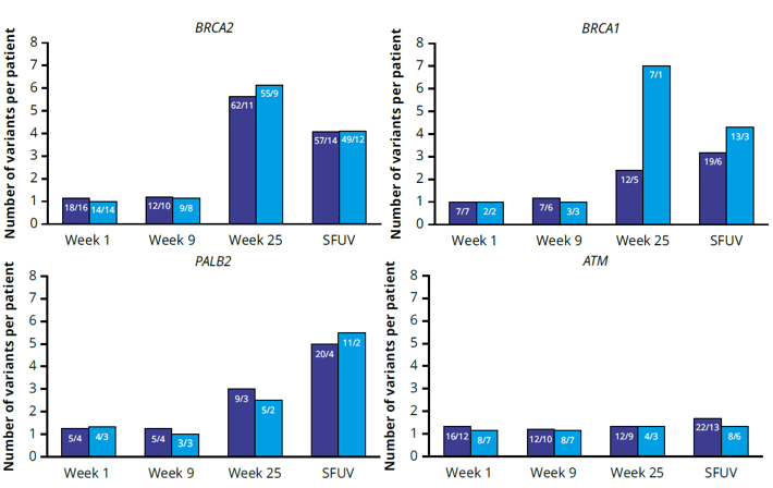 在第1、9、25和SFUV(安全随访)周,BRCA2突变复杂性(变异数/BRCA2m患者数)[每个患者的平均变异数]分别为18/16[1.1]、12/10[1.2]、62/11[5.6]和57/14[4.1]。在第25周,BRCA2变异的中位数是2(范围,1-18;3名患者有≥15种变异)。到第25周,BRCA1和PALB2的突变复杂性也增加了,但ATM的突变复杂性保持不变。