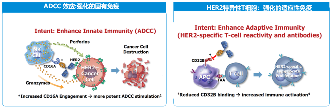 在基础研究上抗HER2联合免疫治疗具有协同作用[3,4]:一方面抗HER2单抗通过激活强化的固有免疫ADCC效应,使得效应细胞与单抗结合后释放穿孔素、颗粒酶等细胞毒物质来杀伤肿瘤细胞;另一方面,通过获得性免疫效应使T细胞激活、增殖。两种免疫激活机制同步产生,抗肿瘤效应得以强化。