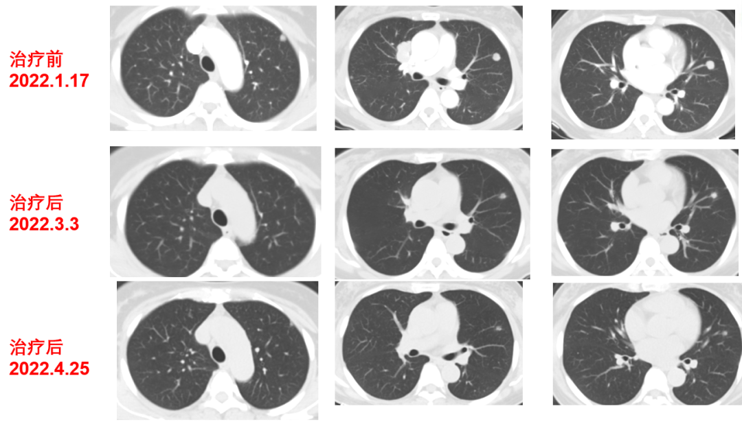 于2021-12-03、2021-12-27给予伊尼妥单抗+吡咯替尼方案治疗2周期。2022.1.19始给予患者伊尼妥单抗+吡咯替尼+替雷利珠单抗治疗,两周期,四周期时的疗效评估可以看到,肺上病灶明显缩小,甚至有的病灶消失,肿瘤标志物也在持续下降。