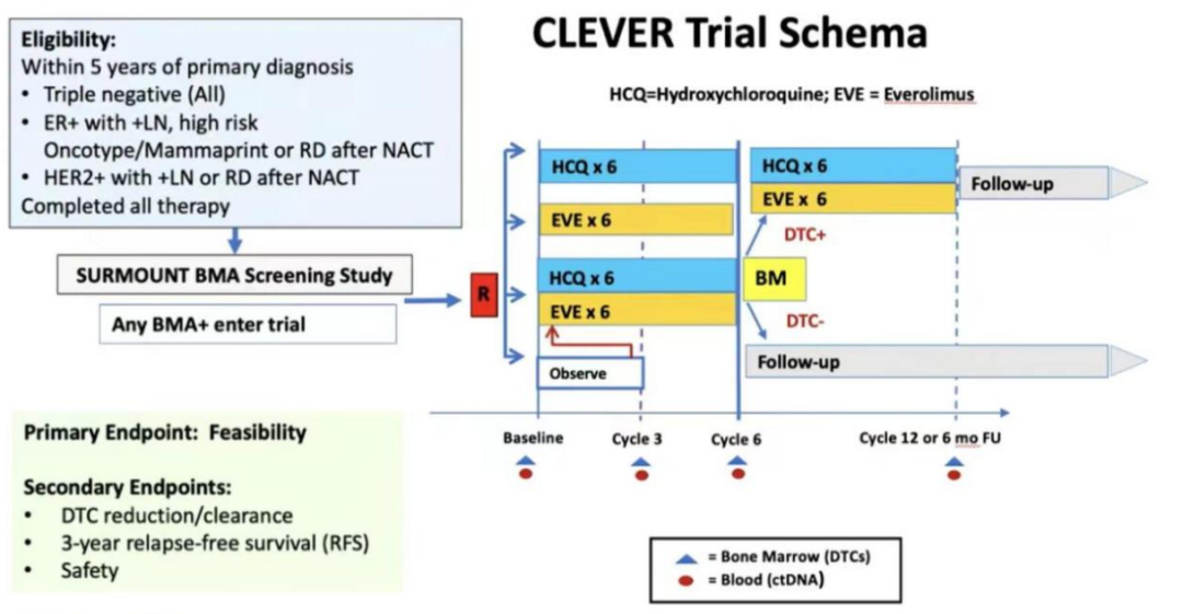 研究方法:CLEVER研究(NCT03032406)是一项Ⅱ期随机临床试验,入组5年内乳腺癌首诊患者且完成所有治疗包括:1、三阴性乳腺癌(TNBC);2、ER阳性伴有淋巴结转移且Oncotype或Mammaprint检测结果为高危或新辅助治疗后存在残余病灶;3、HER2阳性伴淋巴结转移或新辅助治疗后存在残留病灶。所有患者均接受骨髓穿刺,通过免疫组织化学的方法检测骨髓穿刺标本的DTC情况,并将DTC阳性(DTC+)的乳腺癌患者随机分为3组:1、HCQ组(600mg,每日二次)、2、EVE组(10mg,每日一次)、3、HCQ+EVE组(部分患者可有3个月观察期),均应用6个周期(28天/周期)。治疗后仍DTC+的患者继续接受6个周期的HCQ+EVE的联合治疗。另外,入组患者分别于第3、6、12周期后、及全部治疗结束后半年进行DTC检测。不良反应评价依据CTCAE 4.0版。主要研究终点为治疗方案的可行性,即患者完成6个周期治疗后,无3-4级不良事件比例达75%。次要研究终点包括安全性、DTC反应率、3年无复发生存(RFS)。本研究采用贝叶斯泊松回归模型分析DTC反应率。(图1)