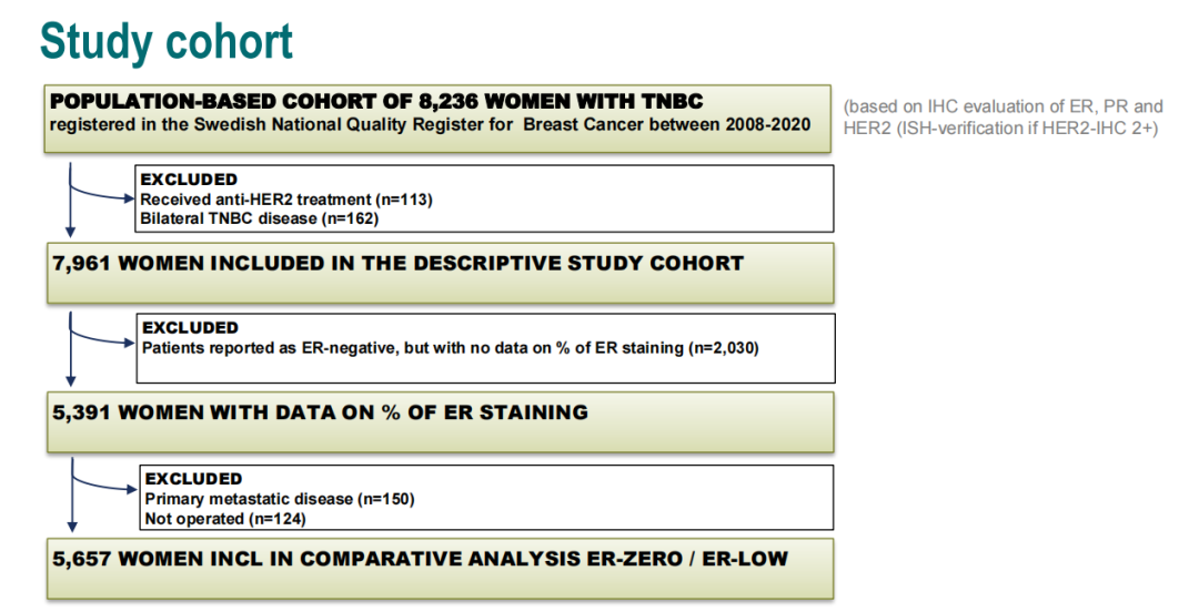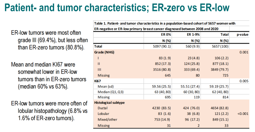 编者按:乳腺癌是一种高度异质性肿瘤,激素受体检测主要用于指导乳腺癌患者的治疗选择,其中雌激素受体(ER)是乳腺肿瘤学中最重要的生物标记物。在2023年ESMO会议上,瑞典乳腺癌研究小组鉴于以往ER低表达乳腺癌在临床病理特征、分子特征、治疗反应和预后等方面的循证医学证据,基于10%的阈值,就真实世界中HER2阴性/ER阴性和ER低表达乳腺癌患者视为三阴性乳腺癌(TNBC)治疗的肿瘤特征、治疗模式和总生存率(OS)进行了更新(241MO)。本文特将该研究进行了编译。
