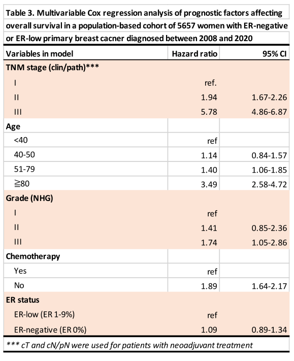 2008~2020年在瑞典被确诊为TNBC的病例被纳入一项基于真实世界的队列研究。通过ER状态(ER阴性0%vs ER低表达1-9%)分析患者的肿瘤和治疗特征,并使用χ2检验比较亚组间的相关性。研究终点为总生存期(OS)和远处无病生存期(DDFS)。Kaplan-Meier生存曲线用于描述时间到事件的终点,Cox比例风险模型用于估计调整后的风险比。
