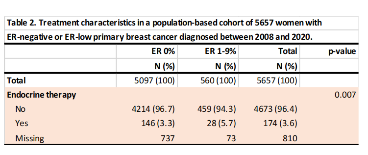 在整个队列中5.7%的ER低表达患者接受了内分泌治疗,而ER阴性比例达到了3.3%。