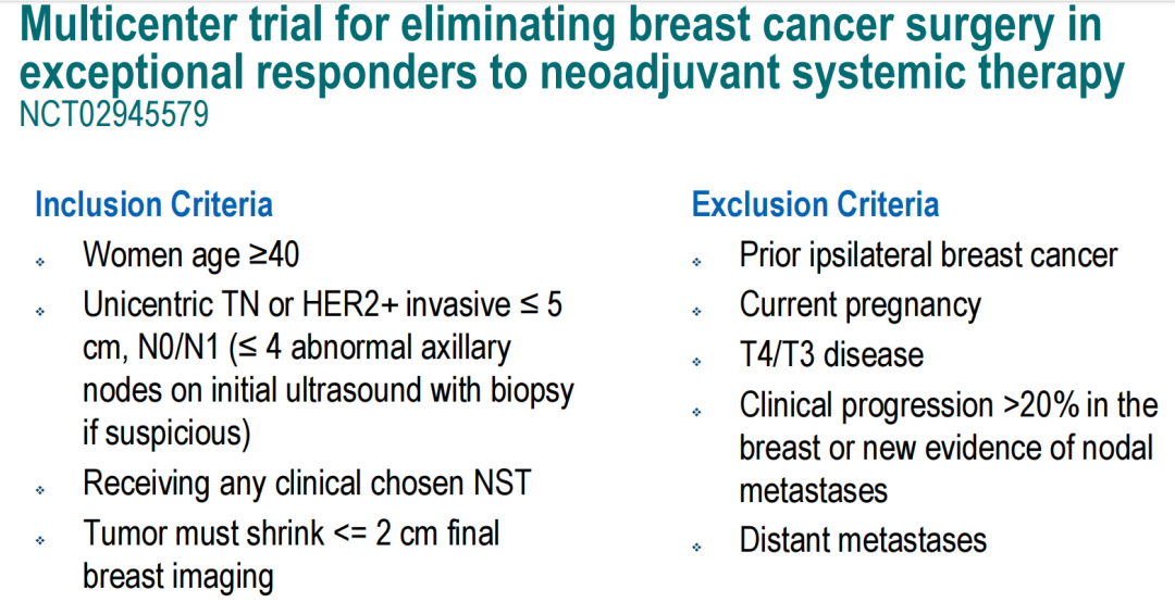 三阴性乳腺癌(TNBC)和HER2+乳腺癌(HER2+BC)的新辅助全身治疗(NST)在大约60%的患者中产生病理完全缓解(pCR)。NST的pCR预示着良好的预后,可通过经皮图像引导的真空辅助核心活检(VACB)准确确定。这项研究探索在新辅助全身疗法(NST)后取得病理学完全缓解(pCR)的三阴性乳腺癌(TNBC)或HER2+BC患者中豁免手术的疗效。其主要目标是评估具有VACB确定的pCR患者在接受放疗的情况下是否可以不进行后续的乳腺手术。纳入标准包括年龄≥40岁的女性、单中心TNBC或HER2+浸润性癌且肿瘤直径<5cm、N0/N1(超声活检疑似异常淋巴结≤4个)、接受过可选的临床NST,最终乳房影像学检查显示肿瘤必须缩小至≤2厘米。排除标准包括既往同侧乳腺癌、怀孕、T3/T4疾病、乳腺癌临床进展>20%或有新的淋巴结转移以及远处转移。