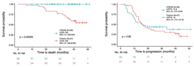 76例患者中,39例接受CDK4/6抑制剂治疗,37例接受化疗。研究组对两组患者进行了随访,虽然两组患者在随访期间的中位总生存期(mOS)尚未达到,但与接受化疗的患者相比,接受CDK4/6抑制剂治疗的患者的OS明显延长(P<0.001)。然而,两组无进展生存(PFS)没有明显差异,化疗组的中位PFS为16.0个月,CDK4/6抑制剂组为15.8个月。