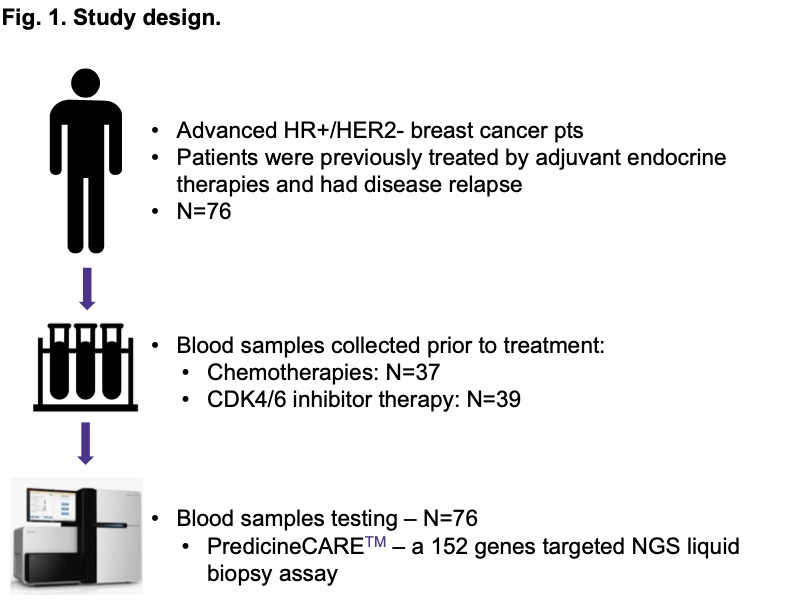 这项回顾性研究共招募了76例晚期HR+/HER2-乳腺癌患者,其中37例一线治疗为化疗,39例为哌柏西利联合内分泌治疗。收集了这些患者在接受化疗和CDK4/6抑制剂治疗前的血浆样本。该研究应用了慧渡医疗的PredicineCARE,即二代测序(NGS)液体活检技术,来检测血液中ctDNA的体细胞改变,包括单核苷酸变异(SNV)、基因融合和拷贝数变异(CNV)。