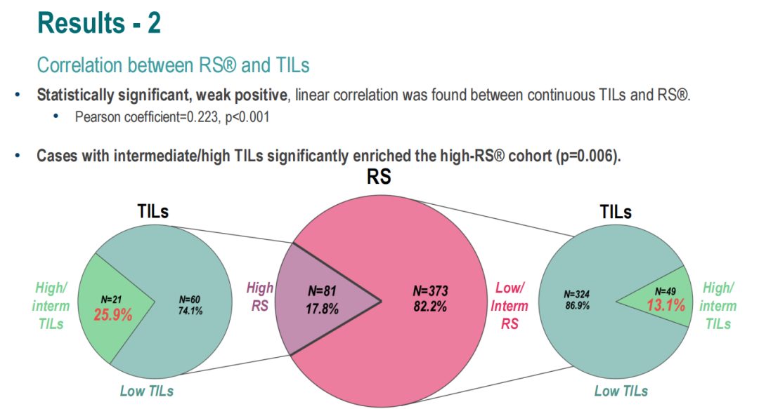 王嘉教授:我认为这项研究还是瞄准于HR+患者的精细分层。如果说ADAPT研究倾向于针对中低危的患者,而比较RS和TILs的这项研究则是针对HR+稍高危的患者,研究可能决定治疗策略的分子标志物。在此之前,我们的认知是RS就是豁免化疗的参考工具,而TILs则是预测HER2+或三阴性乳腺癌患者化疗、靶向治疗、免疫治疗疗效的参考指标。据我所知,该研究是本次ESMO大会上报告的口头研究中首个针对HR+患者,观察RS和TILs相关性的研究。而从这两个指标的本质上来说,RS是肿瘤本身的一个恶性异化程度的评估指标;TILs则是肿瘤微环境中免疫细胞活性的宏观指标。当然,未来可能在TILs中还会发现更多更细致的分子标志物来对免疫细胞进行筛选,虽然TILs都是“警察”,但有一部分是对身体有益的“警察”,而有一部分则是被肿瘤细胞同化的“警察”。即便如此,TILs作为分子标志物,已经在多项研究中被证实能够帮助我们预测HER2+或三阴性乳腺癌患者的化疗、靶向治疗和免疫治疗的疗效。我认为RS和TILs两者有相似的地方,也有不同的地方。这项研究的核心问题是HR+高危人群的进一步复发风险分层,从高危的HR+患者中鉴别出可以通过化疗,甚至是免疫治疗获益的人群。我们设想如果RS与TILs呈线性显著相关,未来我们是否可以对基线高RS患者给予化疗或免疫强化治疗?我认为这项研究是一个初步的探索性研究,未来针对类似的生物标志物(如液态活检)等的研究还会进行更多的探索。