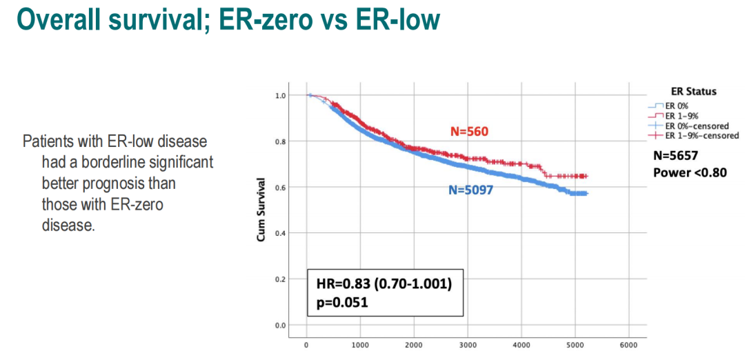 从治疗上来说,国际国内的治疗推荐整体都是重化疗、轻内分泌治疗。尤其我们想给这部分患者做强化治疗,能否应用卵巢功能抑制(OFS),甚至一些靶向药物例如CDK4/6抑制剂来给这部分患者带来更好的风险覆盖?其实指南中都不推荐,也明确说明要谨慎对待这部分患者。毕竟从循证医学的角度来说,SOFT研究中的阈值直接设定为ER≥10%。另外,尽管Monarch E和NATALEE研究将ER+的阈值设定为≥1%,但弱阳性这部分患者究竟入组了多少以及亚组分析中加入CDK4/6抑制剂强化治疗后的获益情况,该研究并未给出具体结果。因此,临床上我们不推荐对于弱阳性患者给予强化对内分泌治疗。我们从本次大会瑞典的这项研究中也看到了相似的结果,ER弱阳性与ER-的患者有相似的特征及预后,且内分泌治疗无获益。对于ER+定义的阈值可能还是设定为1%,但从治疗的角度出发,业界统一的标准还是10%。瑞典的这项真实世界的研究也证实了这一点。