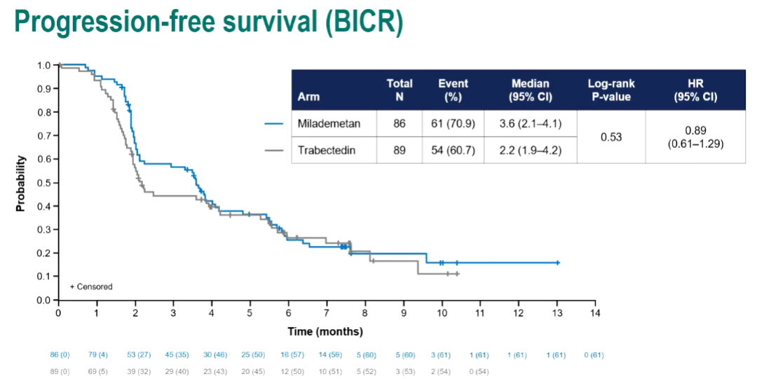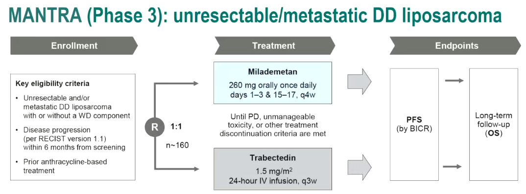 △Ⅲ期MANTRA研究:MDM-2抑制剂(milademetan)对比曲贝替定治疗分化良好型脂肪肉瘤不能显著改善PFS(3.6 vs.2.2个月,HR 0.89,P=0.53)