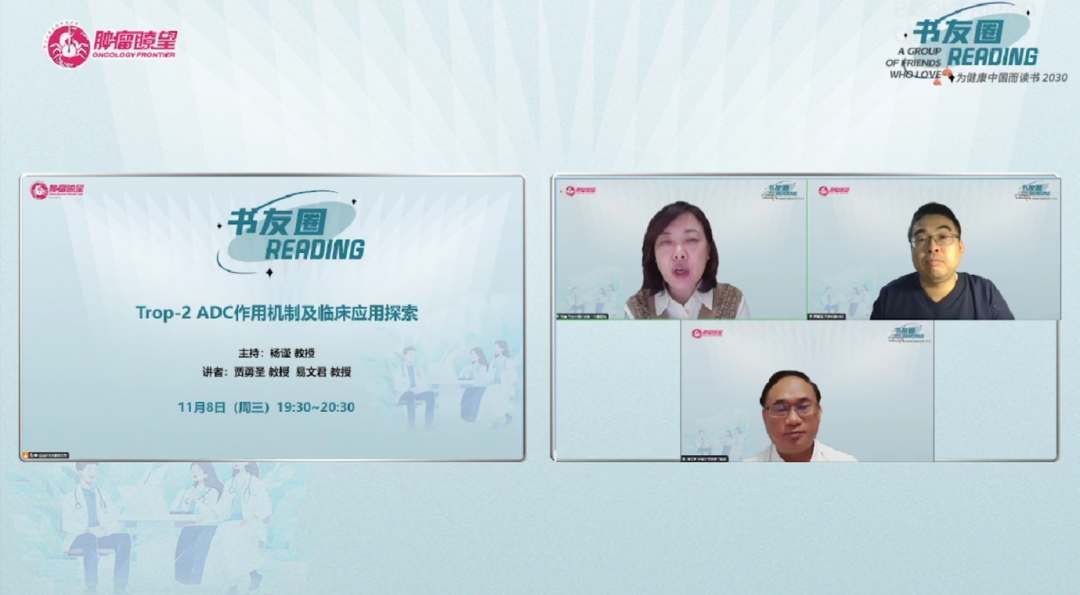 编者按:2023年11月8日19:30,西安交通大学第一医院杨谨教授(主持)与天津医科大学肿瘤医院贾勇圣教授(讲者)、中南大学湘雅二院易文君教授(讲者)共同做客《书友圈》,探讨Trop-2 ADC作用机制及临床应用的相关问题。