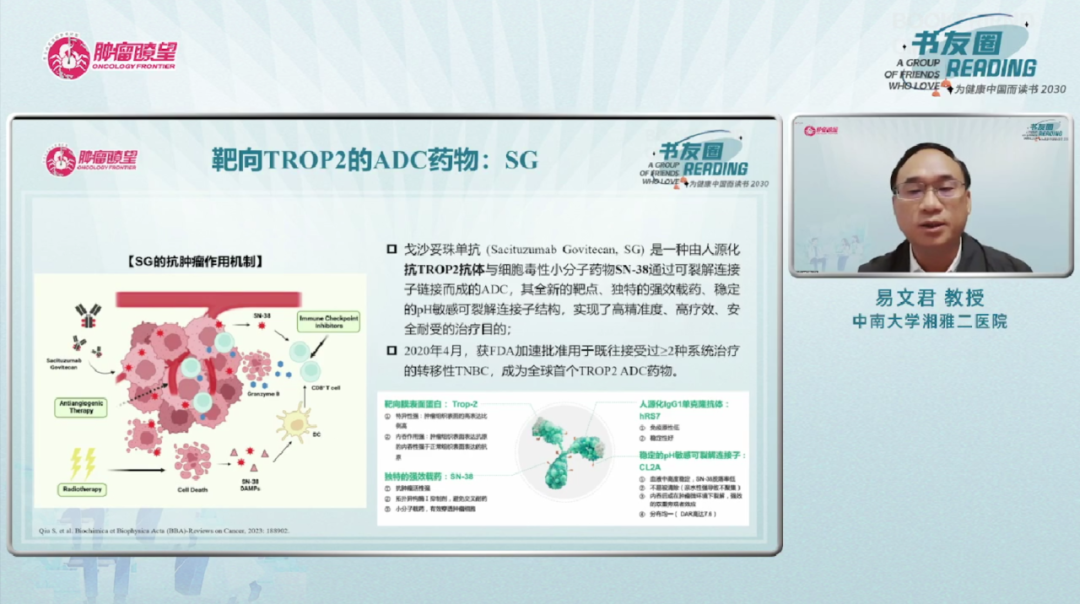 贾勇圣教授带来了《将Trop-2作为癌症驱动的治疗靶点》的讲座。他首先总结了戈沙妥珠单抗(SG)作为代表性Trop-2 ADC药物带来的启发。SG是靶向Trop-2的新一代ADC,美国FDA已批准其用于治疗三阴性乳腺癌(TNBC)、HR+/HER2-乳腺癌和尿路上皮癌。