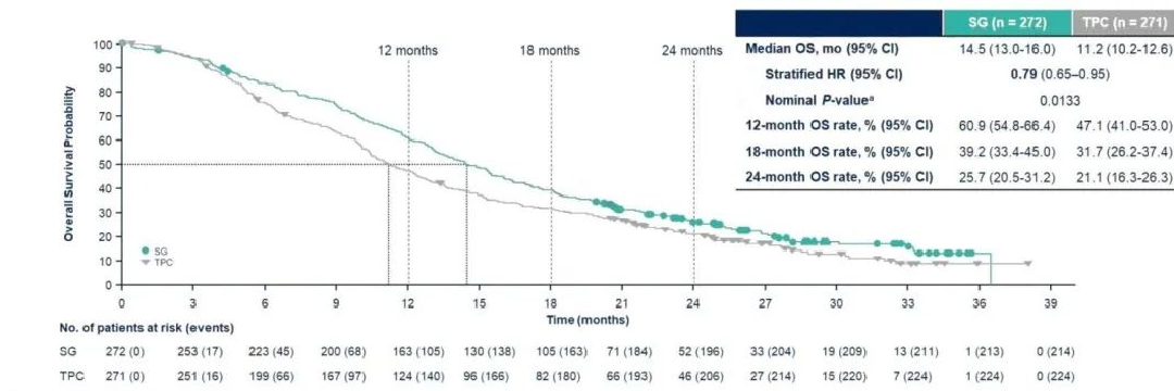 SG在既往接受过至少二线化疗(至少一线用于复发转移阶段)的转移性三阴性乳腺癌(mTNBC)患者中表现出显著临床效果。相较于医生选择治疗(TPC),SG在PFS(5.6 vs.1.7个月,HR=0.39)和OS(12.1 vs.6.7个月,HR=0.48)方面,均表现出明显改善。