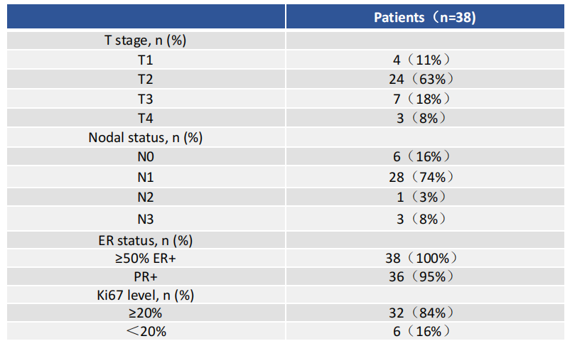 2022年4月至2023年6月期间38例患者筛选入组,全部患者ER≥50%,Ki67≥20%患者占比84%(32/38)。