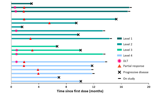 疗效方面,18例患者接受了疗效评估,其中10例获得了确认的部分缓解,16例获得临床获益,ORR和CBR分别为55.6%和88.9%。不同剂量组的DLT发生及治疗缓解情况详见以下游泳图。法米替尼与达尔西利联合血液学毒性可能叠加,将相对更安全的剂量组4作为选定的2期剂量。