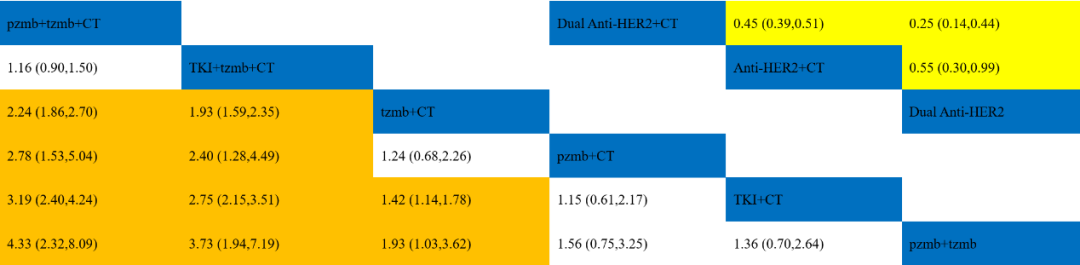 在双靶治疗方案汇总比较中,无论是在总体人群或是激素受体亚组人群中,帕妥珠单抗和曲妥珠单抗联合化疗与小分子TKI协同曲妥珠单抗联合化疗相比疗效无显著差异(OR=1.16,95%CI:0.90~1.50)。(表1a左下、表1b)