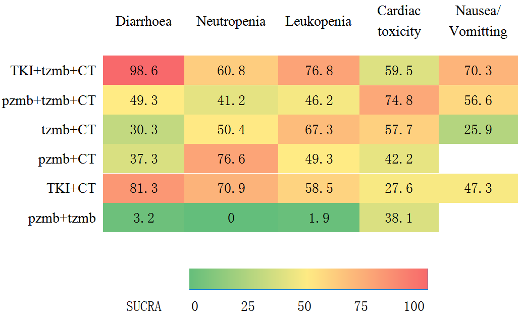 就安全性而言,TKI+曲妥珠单抗联合化疗方案≥3级腹泻、中性粒细胞下降、恶心呕吐的发生风险均为居于首位,SUCRA分别为98.6%、76.8%、70.3%。在心脏毒性方面,双靶联合化疗方案诱发心脏事件的风险最高,SUCRA值为74.8%。(图1)