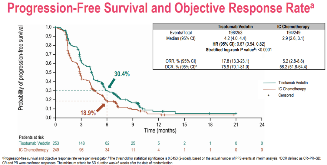 在TV组和化疗组中,确认的ORR分别为17.8%和5.2%(优势比[OR]=4.0;95% CI: 2.1~7.6;P<0.0001),疾病控制率(DCR)分别为75.9%和58.2%。