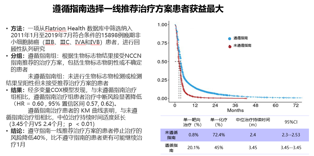 指标九为Ⅳ期肺癌患者首次抗肿瘤药物治疗一线推荐方案采用率,其定义为“诊断为Ⅳ期的肺癌患者首次抗肿瘤药物治疗采用一线推荐方案的患者数占Ⅳ期肺癌患者首次接受抗肿瘤药物治疗患者总数的比例”。一项回顾性队列研究从Flatrion Health数据库中筛选纳入2011年1月至2019年7月符合条件的15898例晚期非小细胞肺癌(NSCLC)一线患者,分为两组,一组是遵循指南组,另一组是未遵循指南组。结论显示:遵循指南选择一线推荐治疗方案的患者获益最大,患者治疗中断的风险降低40%,相比不遵守指南的患者,中位治疗持续时间延长约1个月[2]。每位临床医生都应根据患者情况依据权威指南进行一线治疗方案的推荐。