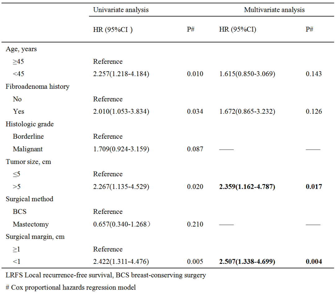 研究方法:我们回顾性分析了2011年3月至2023年12月在重庆医科大学附属第一医院治疗的交界性及恶性叶状肿瘤患者。本研究的主要终点是局部无复发生存期(local recurrence-free survival,LRFS)和无病生存期(disease-free survival,DFS)。采用Kaplan-Meier法估计LRFS和DFS率,并对每个亚组的生存曲线进行log-rank检验。使用单变量和多变量Cox比例风险模型来检验不同变量对LRFS和DFS的影响,并计算风险比(HR)和95%置信区间(CI)。