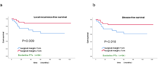 无论是总体人群还是交界性亚型或恶性亚型人群,手术切缘≥1cm患者的LRFS率及DFS率均明显高于手术切缘<1厘米的患者(见图1、2、3)。