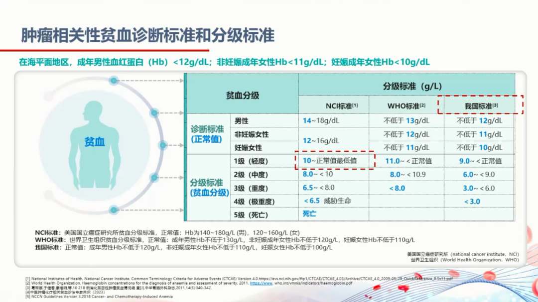 我国目前的肿瘤相关性贫血诊断标准和分级标准为:在海平面地区,成年男性Hb<12 g/dL;非妊娠成年女性Hb<11 g/dL;妊娠成年女性Hb<10 g/dL[2]。与国际NCI标准和WHO标准略有差别。