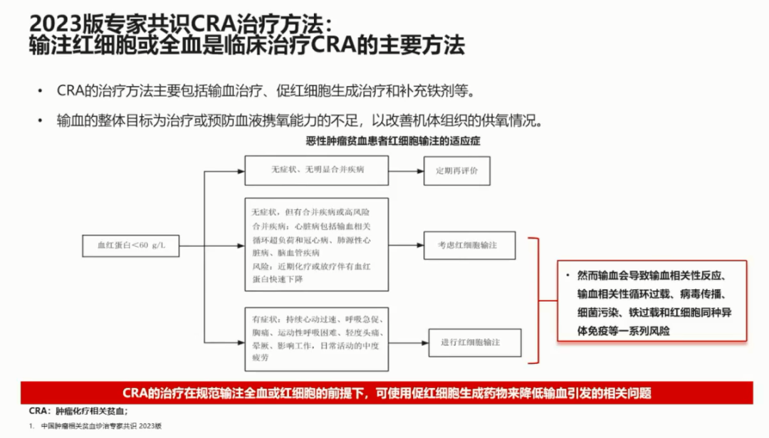 2023版CRA共识强调临床应做好CRA的防治工作。由于血源紧张,全球都在实施更加严格的患者血液管理(PBM)。贫血管理作为PBM的基本原则之一,包括贫血的早期识别和全程监测、提高对贫血的耐受性、及时使用循证医学所支持的药物干预,以支持造血、确定贫血的病因和促进因素、合理输血。贫血管理涉及多个临床学科,需要多学科团队的努力。近年来CDK4/6抑制剂等新型药物发展迅速,研究表明,在化疗前使用曲拉西利,可以降低骨髓抑制发生率,我们也期待未来大型III期临床研究进一步探索其在贫血治疗方面的疗效。