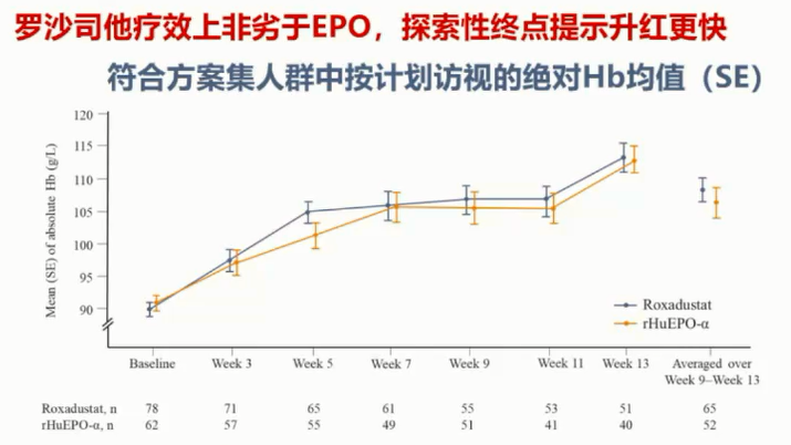 罗沙司他是一种强效可逆性脯氨酸羟化酶抑制剂(HIF-PHI),能够综合调控促红细胞生成的不同环节,而ESA仅调控EPO通路促红细胞生成[11,12]。陆舜教授牵头了一项随机、开放、阳性对照、多中心III期研究[13],该研究旨在分析正在接受化疗的非髓系恶性肿瘤受试者使用罗沙司他治疗贫血的有效性和安全性,研究结果在今年的ESMO大会公布。结果表明,罗沙司他治疗组中Hb水平升高≥10 g/L、≥15 g/L和≥20 g/L的患者比例高于对照组;在FAS人群的罗沙司他治疗组中,观察到Hb首次升高15 g/L和20 g/L的中位时间在数值上更短(罗沙司他治疗组42.0和57.0天,rHuEPO-α治疗组52.0和77.0天)。并且罗沙司他其他关键次要终点均非劣于EPO。探索性终点发现,相较于EPO,罗沙司他或许能够降低输血负担,口服药依从性更优。在安全性方面,罗沙司他与SEPO的安全性相当。