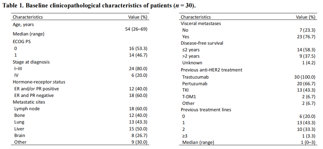 结果:2022年1月13日至2022年12月25日,共纳入30例曲妥珠单抗治疗失败的HER2阳性复发转移乳腺癌患者,中位年龄为54岁,12例(40.0%)患者为激素受体阳性,23例(76.7%)患者存在内脏转移。