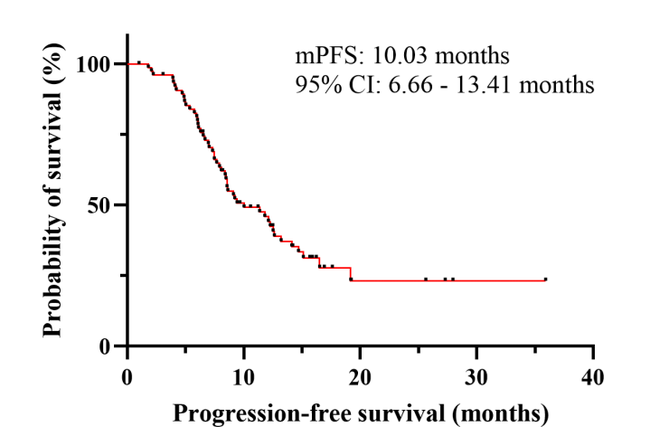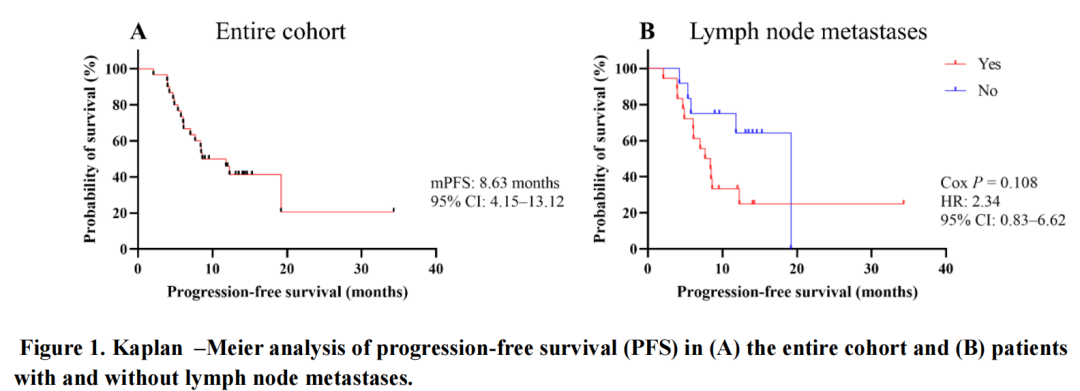 此外,双药联合治疗组的mPFS时间显著长于单药治疗组,mPFS分别为7.1个月(95%CI:5.0~9.2个月)和4.6个月(95%CI:3.5~5.8个月)。最常见的治疗相关不良事件是AST(45.8%)及ALT升高(41.7%)、白细胞计数降低(25.0%)和疲劳(25%)等,且大多数严重程度都为1~2级。