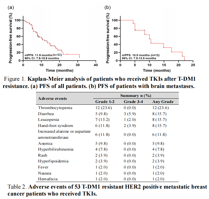 结论:TKI在既往T-DM1耐药的HER2阳性晚期乳腺癌患者中具有良好的疗效和安全性。