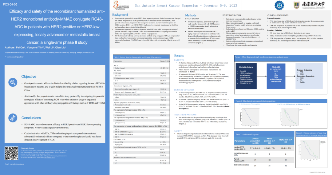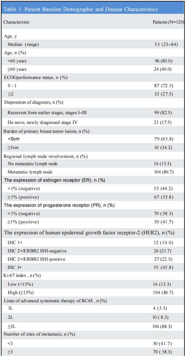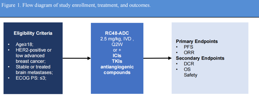 题目:重组人源化抗HER2单克隆抗体-MMAE偶联药物RC48-ADC在HER2阳性或HER2低表达、局部晚期或转移性乳腺癌患者中的有效性和安全性:一项单臂Ⅱ期临床研究