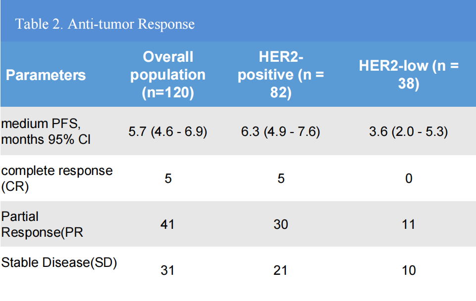 在总体人群中,中位PFS为5.7个月(95%CI:4.6~6.9个月),ORR和DCR分别为38.3%和64.2%。在HER2阳性亚组中,ORR和mPFS分别为42.7%和6.3个月(95%CI:4.9~7.6个月)。在HER2低表达亚组中,ORR和mPFS分别为29.0%和3.6个月(95%CI:2.0~5.3个月)。